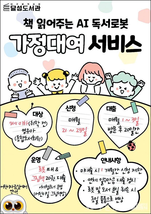 - 달서구 월성1동 복합청사에 24시간 운영되는 ‘스마트도서관’이 문을 열었다. 스마트도서관은 도서를 비치한 무인 대출·반납 시스템으로, 365일 24시간 운영된다. 주민들은 시간에 구애받지 않고 자유롭게 책을 빌리고 반납할 수 있어 생활 속 독서 접근성이 크게 높아질 것으로 기대된다.이용 대상은 대구시 통합도서관 회원으로...