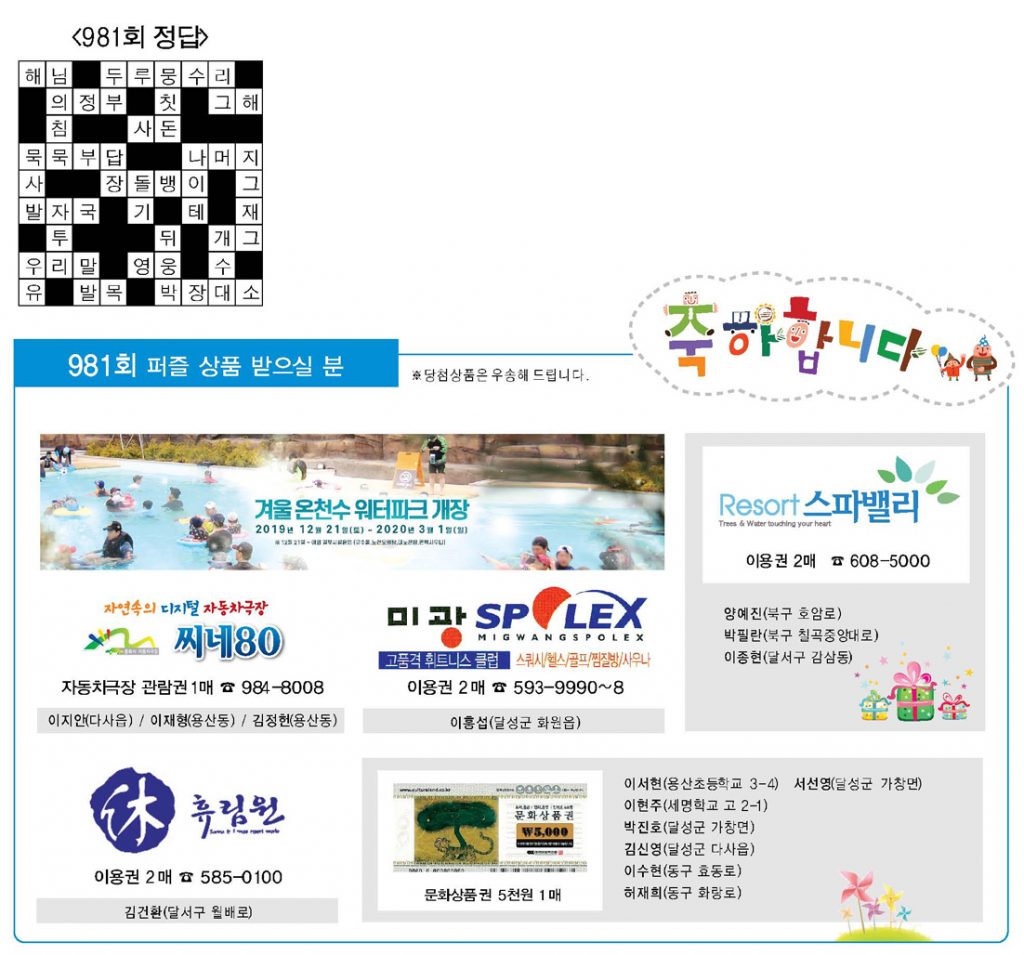 E-mail:pr5726000@naver.com ☞응모엽서에 성명과 우편번호를 반드시 적어 주세요. ▶정답자 발표 : 1,131호