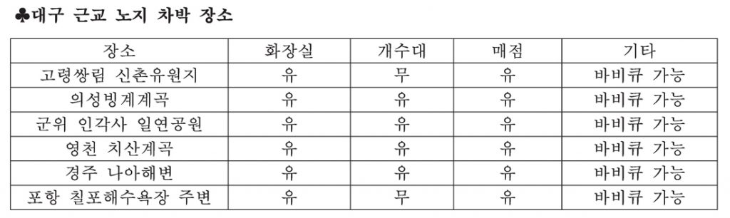 차박의 매력은 숙박비가 절감되어 경제적이란 것과 내 안의 감성을 자연과 함께 오롯이 즐길 수 있는 장점이 있다. 단점은 화장실 이용과 씻기가 불편하고 여름이 아니면 밤에는 추울 수가 있어 침낭이나 파카를 준비해야 한다. 그러나 유료 오토캠핑장을 이용하면 전기, 샤워장, 화장실을 불편 없이 사용할 수가 있다. 대구 근교에도 인터넷을 검색하면 유료 오토캠핑장이 많이 있다. 하지만 차박의 또 다른 매력은 노지 차박이다. 하룻밤 불편함을 감수하고 모닥불 피워놓고 총총한 밤하늘의 별을 바라보노라면 스무 살 감성이 되살아난다.