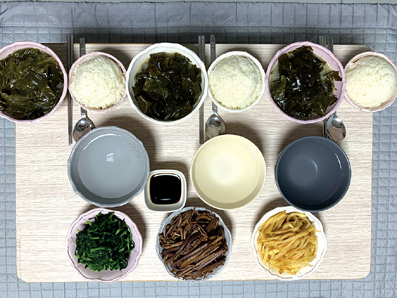 먼저 삼신상에는 도라지, 고사리, 시금치 이렇게 세 가지 나물을 기본으로 한다. 여기에 정화수, 흰쌀밥, 미역국을 올리는데 특이하게 소고기를 넣지 않은 미역국으로 준비한다.