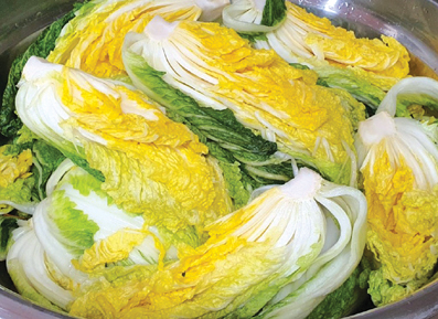 통에 담을 때는 발효되면서 생기는 가스가 머물 공간을 마련하기 위해 저장용기에 80%만 채우는 것이 좋다. 그리고 공기를 최대한 차단해주는 것이 좋기 때문에 따로 떼어서 절여두었던 겉잎을 넓게 펴서 꼭꼭 덮어주도록 하자.