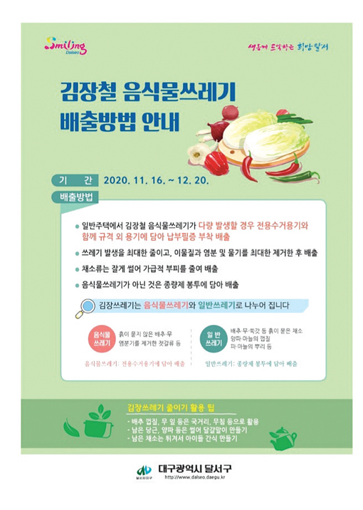 김장 쓰레기 집중 수거 기간은 11월16일부터 12월20일까지 이고 일반주택 및 사업장은 전날 밤8시 부터 익일 새벽 2시까지이다. 아파트는 이전과 같은 방법으로 수거하고 있다. 궁금한 사항은 달서구 청소과 재활용팀(☎053-667-2726)으로 문의하면 된다.