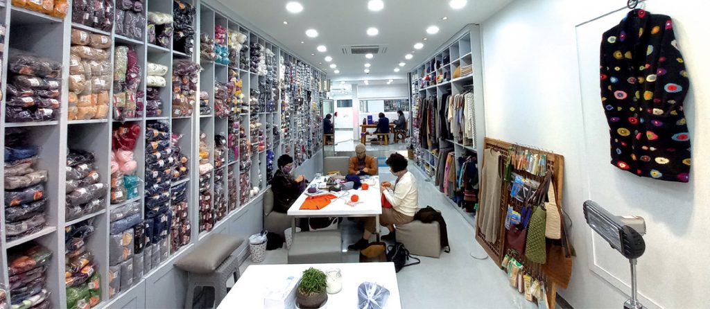옷의 크기에 따라 다르지만 대략 1∼2주면 한 개를 뜰 수 있단다. 한 회원은 칠곡 왜관에서 기차를 타고 공방에 나오신다고 했다. 혼자 집에서 해도 되지만 하다가 막히는 부분이 있으면 전문가의 조언을 받아 곧바로 해결할 수 있고 다른 회원들과 소통하는 즐거움이 크기 때문에 꼭 이곳에 나와서 작업을 하신다고 했다. 뜨개질 마니아들의 사랑방인 셈이다. 코로나 때문에 예전보다는 공방에 나오는 사람들의 숫자가 줄었지만 그래도 기자가 찾아갔을 때 예닐곱 명이 마스크 꼼꼼하게 쓰고 띄엄띄엄 앉아서 각자의 뜨개질 삼매경에 빠져 있었다. 눈과 손의 협응 작업이기 때문에 치매예방에도 좋고 작업하다 보면 시간도 정말 잘 가서 혼자서 할 수 있는 놀이로는 최고라고 한다. 물론 장시간 같은 자세로 뜨개질을 하면 허리나 어깨, 목에 무리가 올 수 있으니 적절한 스트레칭과 쉼을 하면서 뜨개질해야 한다고 공방 주인은 조언한다.