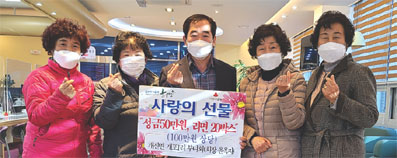 고령군 개진면 개포1리 부녀회(회장 윤옥자) 회원들이 성금 50만 원과 라면 20박스(50만 원 상당)를 개진면에 기탁했다. 윤옥자 회장은 우리식당을 운영하면서 성금 50만 원도 기탁했다.