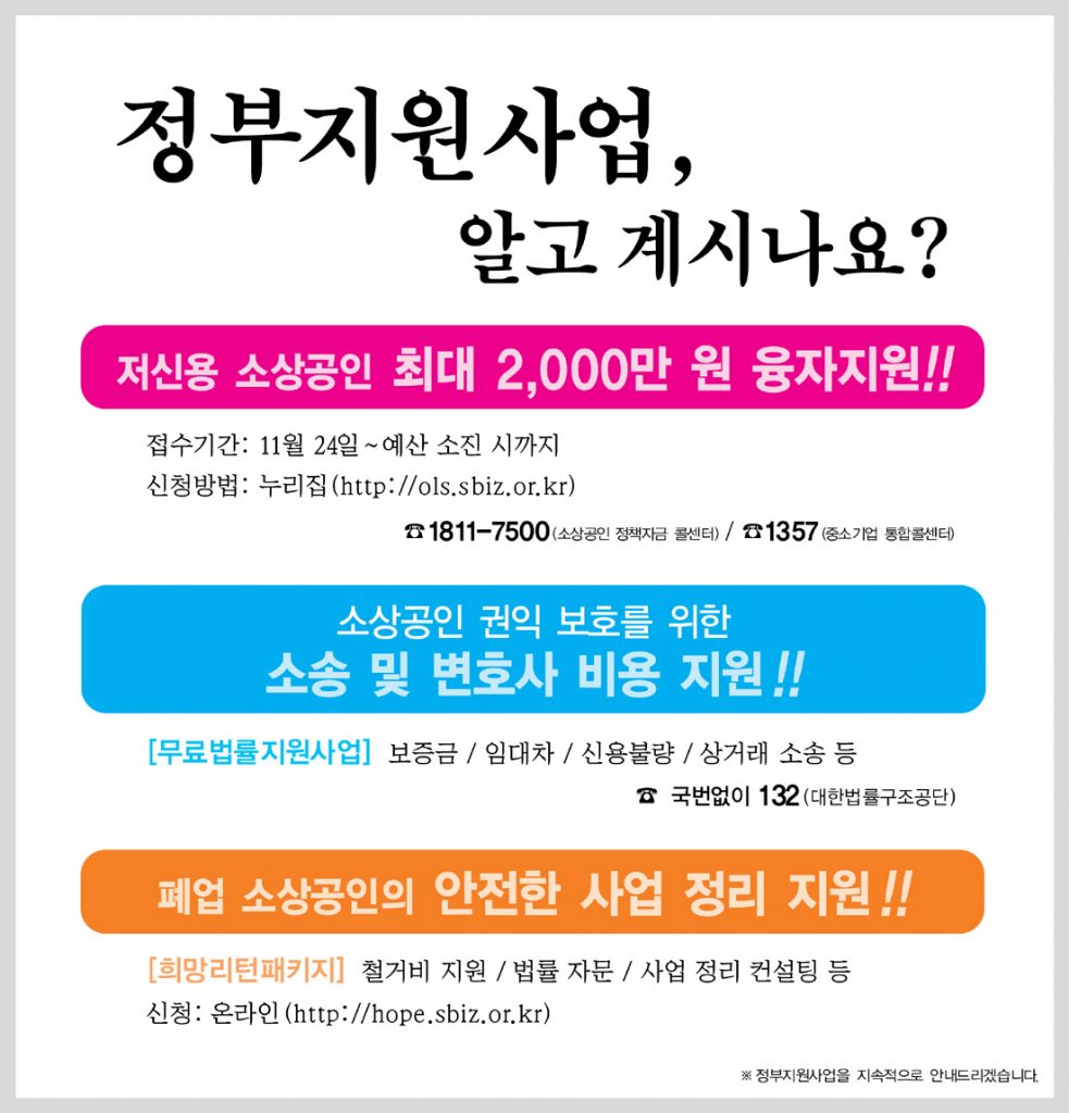 문의처 : 소상공인 정책자금 콜센터(1811-7500), 중소기업 통합콜센터(1357)