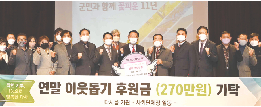 다사읍 기관·사회단체장이 지난 21일 달성문화센터에서 개최된 ‘2021년도 이·반장 교육’에 참석해 연말을 맞아 어려운 이웃에게 나눔을 실천하고자 후원금 270만 원을 행정복지센터에 기탁했다.