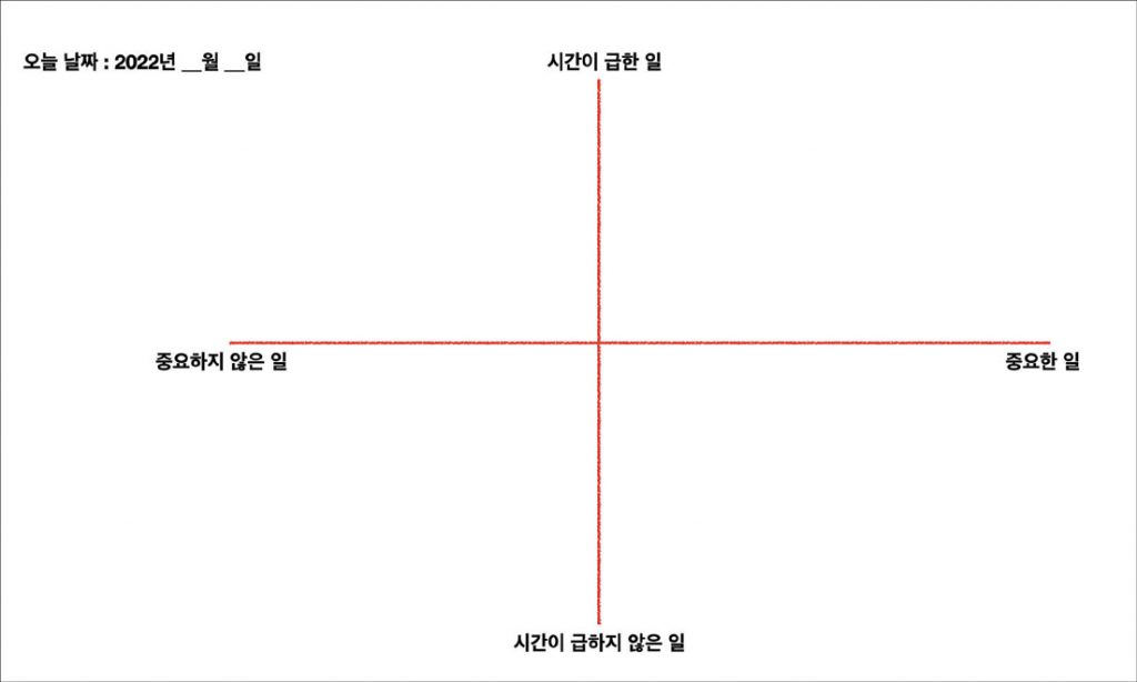 우선순위에 입각한 할 일 목록 정리하기로 표현할 수 있는데 어떻게 할 수 있을까? 우선 노트에다가 4사분면을 그려본다. 가로축에는 중요도로 좌측 우측을 나눈다. 좌에는 중요하지 않은 일, 우측에는 중요한 일이 표시되게 필기를 하고 나머지 세로축을 그린다. 아래는 시간이 급하지 않은 일 위에는 시간이 급한 일을 표시한다. 그렇게 되면 총 4가지 섹터가 만들어지게 된다. 중요하지 않고 시간도 급하지 않은 일, 중요하지 않지만 시간이 급한 일, 중요하지만 시간이 급하지 않은 일, 중요하고 시간도 급한 일 이렇게 나뉘게 된다. 말로 설명한 이 부분이 헷갈리는 독자분들께서는 필자가 직접 그린 아래 4사분면을 참고하시면 쉽게 이해가 될 것이다.
