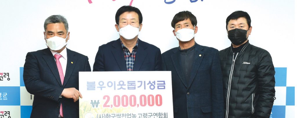 (사)한국쌀전업농 고령군연합회(회장 김성기)는 지난 19일(수) 고령군청을 방문해 불우 이웃돕기 성금 200만 원을 기부했다.