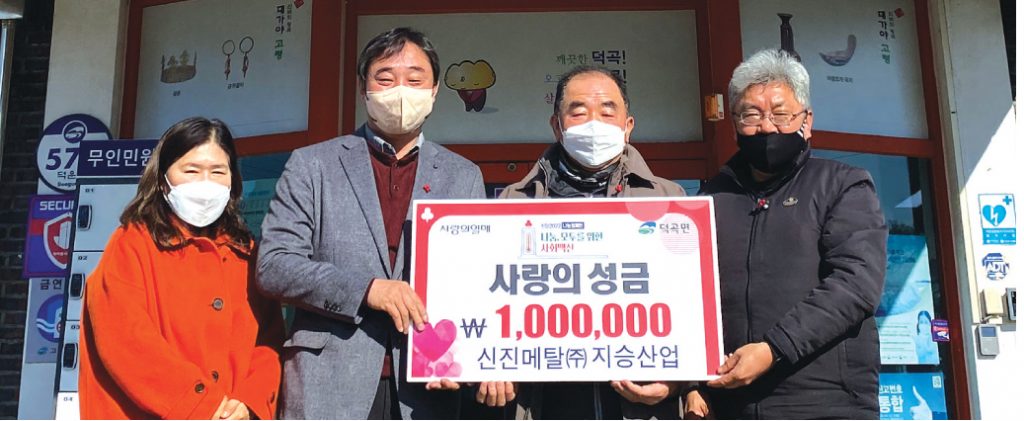 신진메탈㈜·지승산업 이사 임상래는 지난 20일(목) 덕곡면(면장 최용석)을 방문해 고향 이웃을 위해 사랑의 이웃돕기 성금 100만 원을 기탁했다.