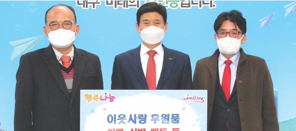 달서구는 지난달 22일 (사) 한국 장애인 마이스 협회로부터 관내 어려운 이웃들에게 지원해달라며, 신발, 점퍼, 발열조끼, 매트 등(약 1,100만 원 상당)을 기탁 받았다고 밝혔다. 전달식에는 이태훈 달서구청장, 심만섭 이사장 등이 참석했으며, 이날 전달된 후원품은 관내 행정복지센터를 통해 저소득층에 지원될 예정이다.