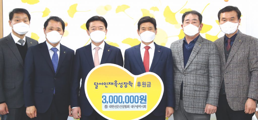 대한전문건설협회 대구광역시회(회장 김 석)가 지난달 22일 달성군의 참된 인재 양성을 위해 써 달라며 달성군청을 방문해 300만 원의 기탁금을 (재)달성장학재단에 전달했다. 대한전문건설협회 대구광역시회는 2016년부터 매년 장학재단에 장학금을 기탁하는 등 꾸준히 지역사랑을 실천하고 있는 곳이다.