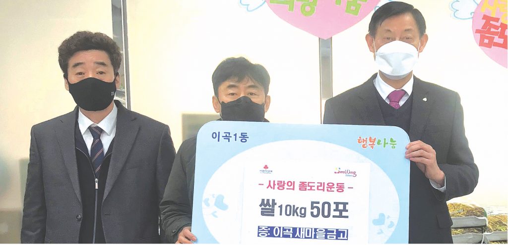달서구 이곡1동은 지난달 24일 이곡새마을금고(이사장 허노교)에서 사랑의 좀도리운동으로 모은 백미 10㎏ 50포를 저소득가정을 위해 후원했다고 밝혔다. 이번에 좀도리운동으로 모은 백미는 코로나19의 지속으로 인해 어려움을 겪고 있는 저소득 가정에 전달될 예정이다.