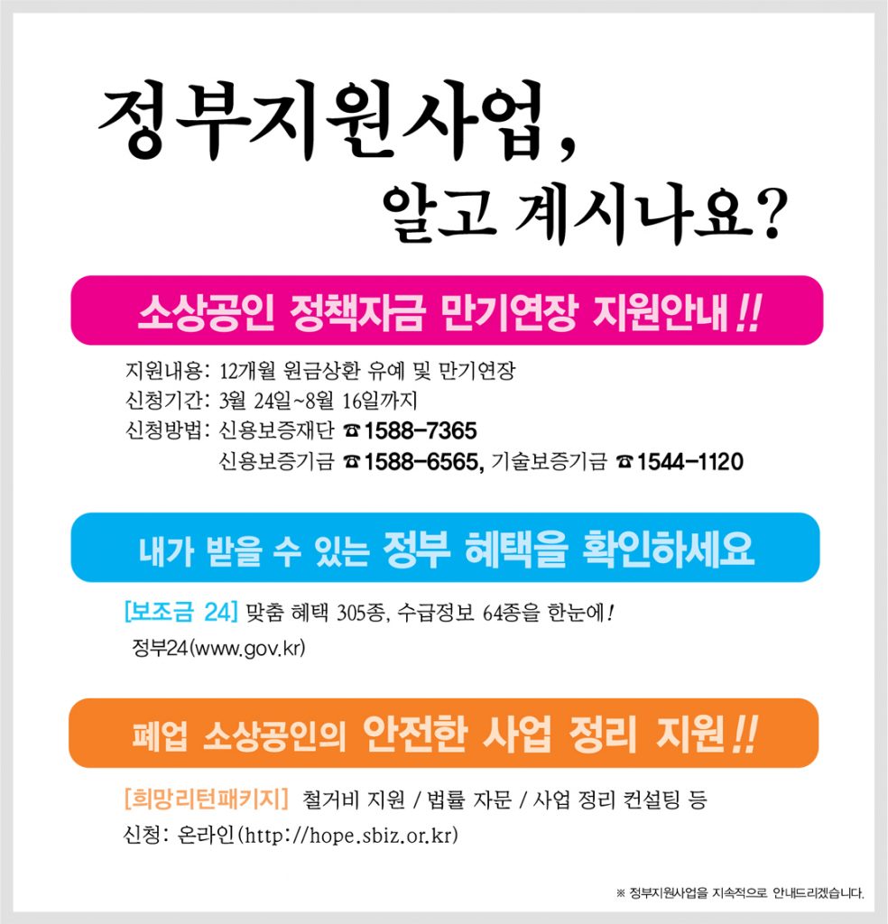신청방법 : 신용보증재단(1588-7365), 신용보증기금(1588-6565), 기술보증기금(1544-1120)