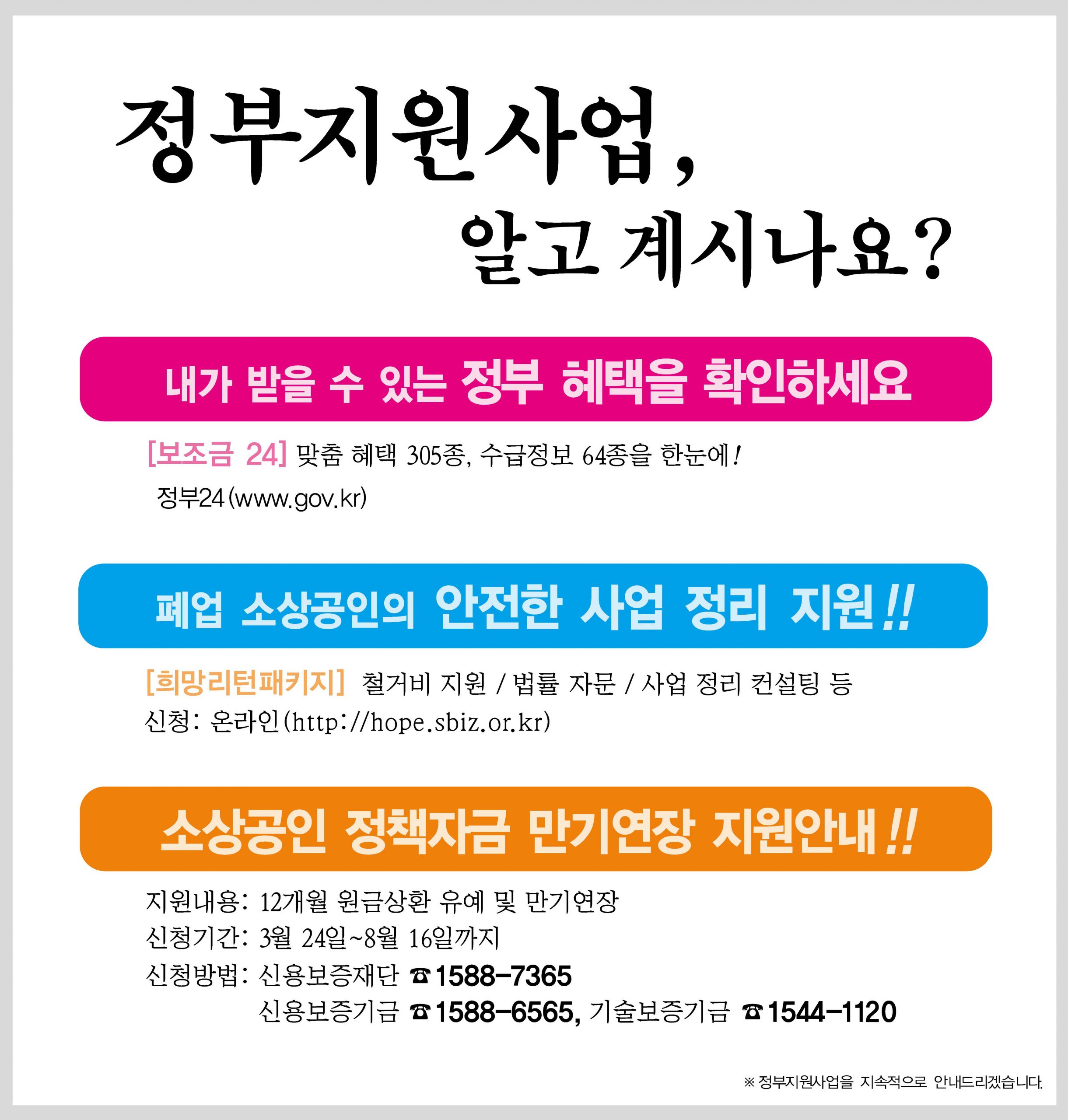 신청방법 : 신용보증재단(1588-7365), 신용보증기금(1588-6565), 기술보증기금(1544-1120)