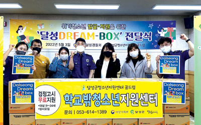 달성군학교밖청소년지원센터(센터장 김지향)가 지난 3일 달성군 학교 밖 청소년들의 건강한 일상생활을 돕기 위해 달성경찰서와 함께 다양한 생필품으로 구성된 달성드림박스를 지원했다.