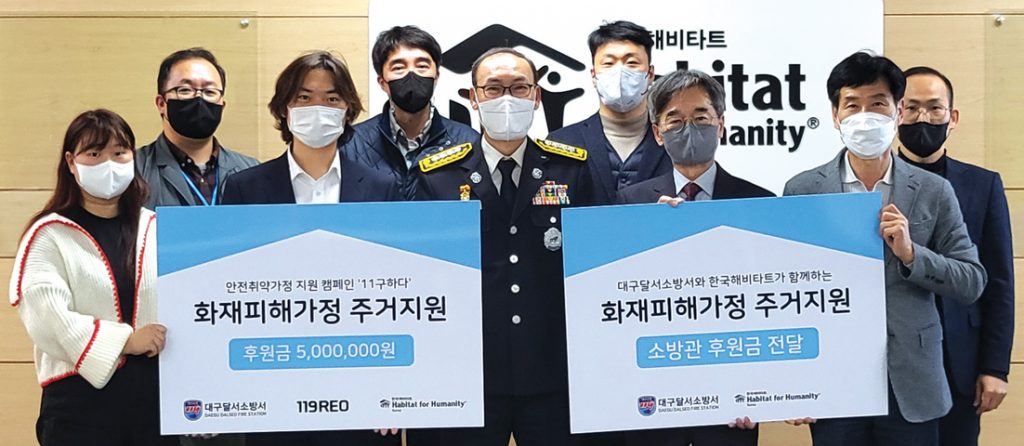 달서소방서(서장 이진우)는 한국해비타트, 119REO와 함께 지난 24일(목) 불의의 화재로 피해를 본 이재민의 주거 개선 및 일상 회복을 위한 기부금 전달식을 했다.