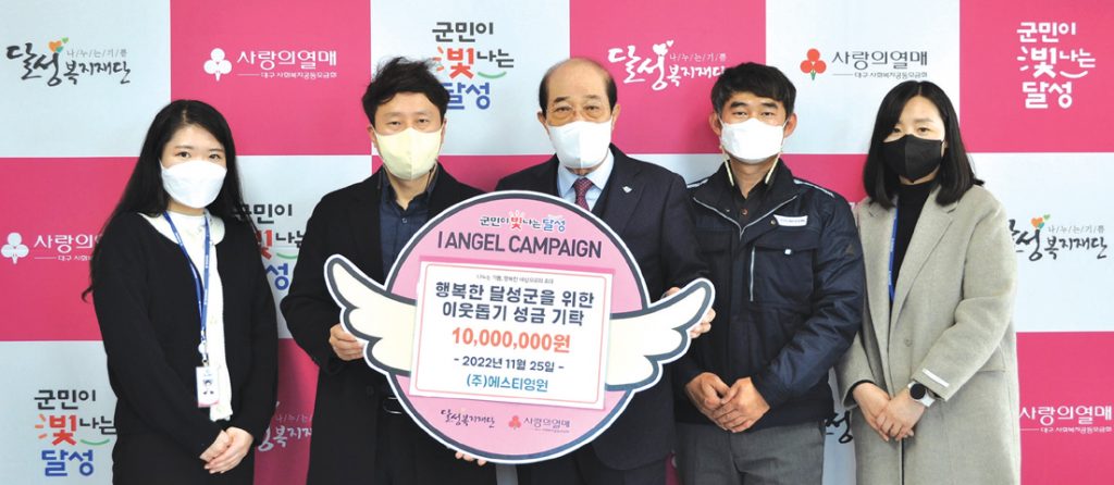 ㈜에스티영원은 지난 11월 25일(금) 달성복지재단(이사장 차준용)에 후원성금 1,000만 원을 기탁했다.