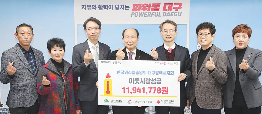 (사)한국외식업중앙회 대구시지회(지회장 김동근)성금 1,100여만 원 전달(사)한국외식업중앙회 대구시지회(지회장 김동근)는 지난 16일(월) 성금 1,100여만 원을 대구사회복지공동모금회(회장 김수학)에 전달했다.