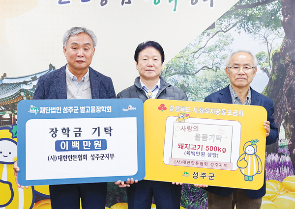 (사)대한한돈협회 성주지부는 지난 2일(월) 지역 인재 육성과 관내 어려운 이웃을 위해 돼지고기 500㎏(600만 원 상당)을 성주군에 기탁했다.