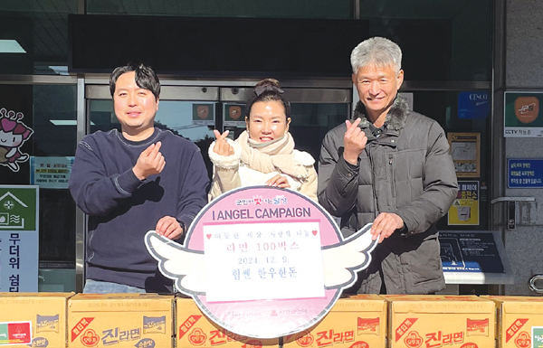 힘쎈한우한돈(대표 모윤애)는 지난 9일(월) 연말을 맞이해 어려운 이웃을 위해 사용해 달라며 라면 100박스를 옥포읍에 기탁했다.