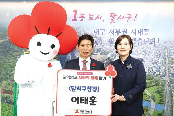 달서구(구청장 이태훈)가 지난 6일(금) 구청에서 대구사회복지공동모금회(회장 김수학)와 함께 ‘사랑의 열매 달기’ 릴레이에 참여해 나눔 문화 확산에 동참했다. 이날 행사에서 따뜻한 겨울나기 지원사업으로 달서구에 5,770만 원이 전달됐다. 기탁된 성금은 저소득 취약계층 577세대에게 10만 원씩 지원된다.