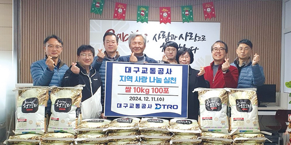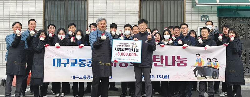 대구교통공사는 지난주 ESG경영 활동의 일환으로 지역사회 취약계층의 따뜻한 겨울나기 지원을 위해 사랑의 쌀나눔 행사 및 연탄배달 봉사활동을 진행했다. 지난 11일(수) 지역 생산품인 쌀(10kg) 100포를 구매해 달서구 상인 3동에 위치한 상인종합사회복지관에 후원했으며, 13일(금)에는 임원진 및 참사랑봉사단원 30여 명이 서구 비산동 일대 취약계층 세대에 직접 연탄배달 봉사와 함께 후원금 300만 원을 기부했다.