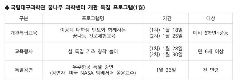 특히 1월과 2월에는 설 명절 기간 및 방학 기간을 맞아 신규교육과 함께 다양한 개관 특집 교육과 행사가 운영될 예정이다. 자세한 교육 과정 및 일정과 교육예약은 국립대구과학관 홈페이지(www.dnsm.or.kr)에서 확인할 수 있다.