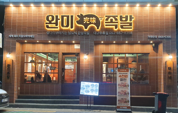 ‘완미족발’은 대구 두류역 7번 출구에서 도보로 약 360m 거리에 위치해 있으며, 두류동 먹자골목 내에 자리 잡고 있다. 이 지역은 다양한 먹거리가 밀집해 있어 먹거리 여행을 즐기는 이들에게 인기가 많다. 주차장이 따로 마련되어 있지 않기 때문에 대중교통을 이용하는 것이 더욱 편리하다. 가게 내부는 넓고 아늑한 분위기로 꾸며져 있으며, 테이블 간격도 여유로워 단체 손님도 수용할 수 있는 공간을 제공한다. 가족이나 친구들과 편안하게 식사하기 좋은 곳이다.