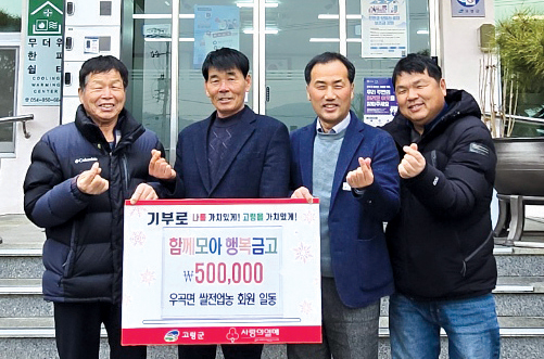 우곡면 쌀전업농(회장 김대연)은 지난 6일(월) 우곡면사무소를 방문해 이웃사랑 실천을 위해 ‘함께모아 행복금고’ 성금 50만 원을 기탁했다.