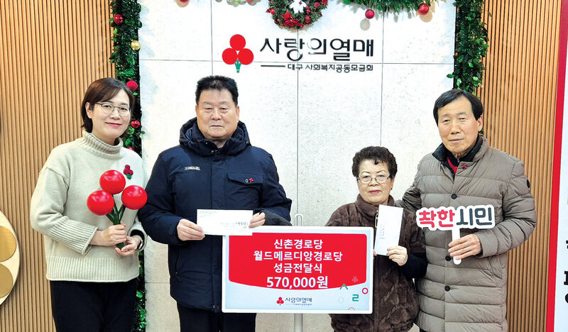 대한노인회 대구 달서구지회(회장 김해동)는 지난 13일(월) 어르신들이 평소 모아온 금액을 불우이웃돕기 성금으로, 신촌경로당 회장 이경순외 46명의 회원들이 정성들여 모은 성금 47만 원과 월성월드메르디앙 회장 박익규외 26명이 모은 10만 원을 대구사회복지공동모금회에 기부했다.