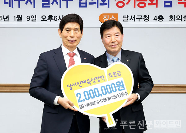 남용수 민족통일 달서구협의회 회장이 지역 인재 육성을 위해 써달라며 200만 원의 후원금을 달서인재육성장학재단에 전달했다.