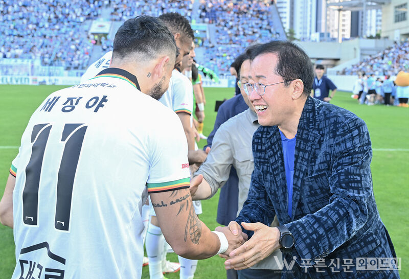 홍준표 대구시장이 대구FC 소속 세징야 선수에게 격려의 인사를 전하고 있다. [제공=대구시]