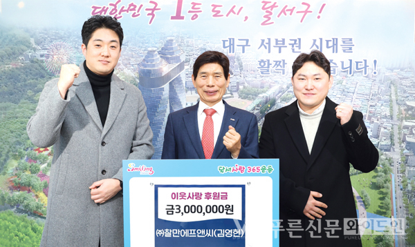 ㈜찰만에프앤씨(대표 김영욱)는 관내 어려운 이웃을 위해 써달라며 300만 원을 달서구에 기탁했다.