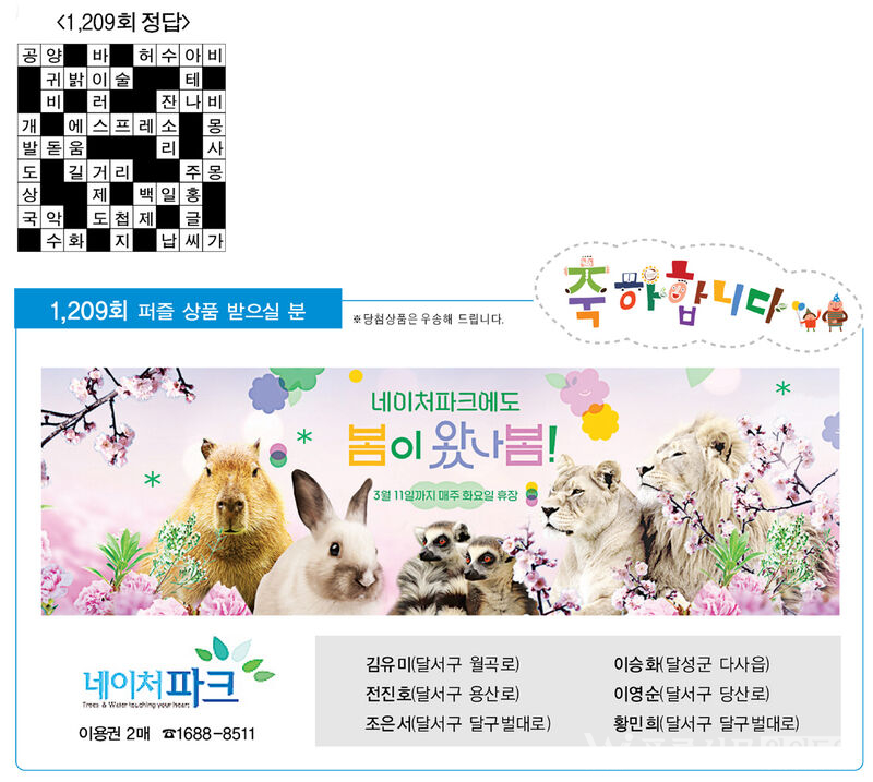 ♣ ‘가족과 함께 풀어보세요’정답을 아시는 분은 본사 편집부로 보내주시기 바랍니다. 3월 18일(화)까지 도착된 엽서 중에서 추첨을 통해 상품을 드립니다. 주소를 정확히 기재해 주십시오. 당첨상품을 우송해 드립니다.