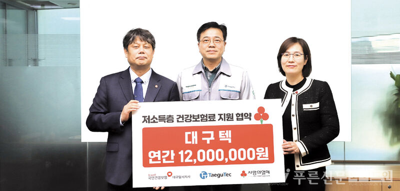 국민건강보험공단 대구달서지사(지사장 김승국)는 대구텍 유한책임회사·대구 사회복지공동모금회와 함께 ‘저소득층 건강·노인장기요양보험료 지원 협약’을 맺었다.