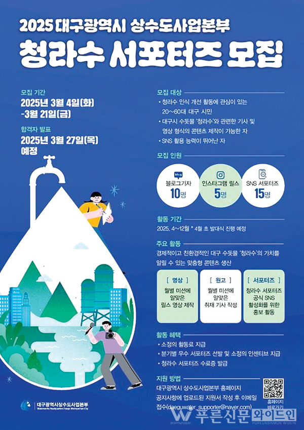 대구광역시 상수도사업본부는 3월 21일(금)까지 대구 시민을 대상으로 대구 수돗물 청라수를 알릴 ‘2025년 청라수 서포터즈’를 모집한다.