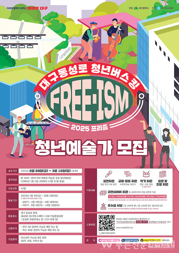 이번 청년예술가 공개모집은 만 19세~39세 국내·외 청년을 대상으로 하며, 개인 또는 팀 단위로 신청할 수 있다. 동성로 청년 버스킹 참가신청은 오는 3월 16일(일) 오후 6시까지 받으며 자세한 사항은 (사)인디053 홈페이지(www.indie053.net)를 통해 확인할 수 있다.