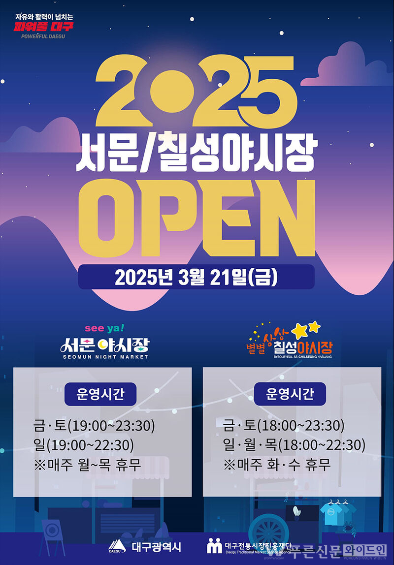 대구광역시와 대구전통시장진흥재단은 전국 대표 야간관광명소인 서문·칠성 야시장을 약 3개월의 동절기 휴장기간 동안 새단장을 마치고 3월 21일(금)부터 개장한다고 밝혔다.