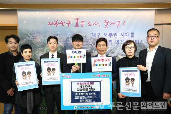롯데백화점 상인점(점장 장윤석), 프리밸런스 & 메지스(대표 김광배), 최복호패션(대표 최주영)은 관내 어려운 이웃들에게 지원해달라며 백미 800㎏(200만 원 상당)을 달서구에 기탁했다.