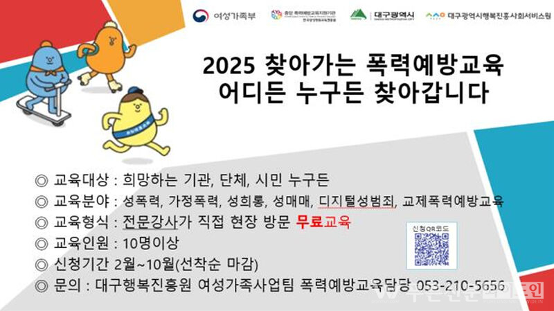 교육을 희망하는 기관은 대구광역시행복진흥사회서비스원(053-210-5656)으로 문의하거나 ‘예방교육통합관리’ 홈페이지(http://shp.mogef.go.kr)를 통해 신청할 수 있다.