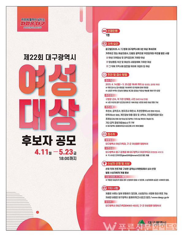 대구광역시는 여성의 지위향상과 양성평등사회 구현을 위해 공헌한 여성을 발굴하기 위해 5월 23일(금)까지 ‘제22회 대구광역시 여성대상’ 수상후보자를 공개 모집한다.