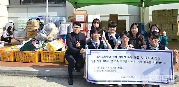 도원고(교장 박대호)는 학생들이 지난 해 학교 축제 ‘도담종합예술제’ 체험 부스 운영을 통해 얻은 수익금 1,33만 7,916원 전액과 자발적 기증으로 마련한 구호 물품을 경상북도 청송군 산불 피해 주민들에게 기부했다.