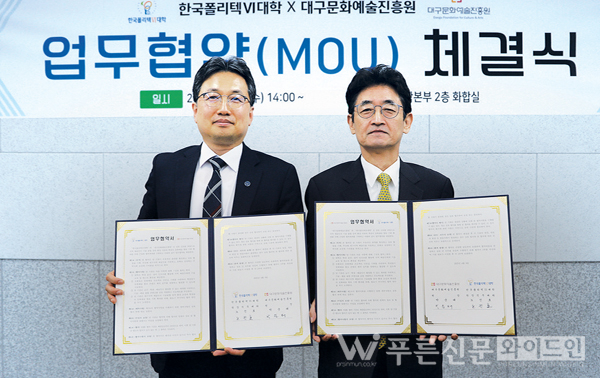 대구문화예술진흥원(원장 박순태, 이하 ‘진흥원’)이 한국폴리텍Ⅵ대학(학장직무대리 노진호, 이하 ‘폴리텍대학’)과 지난 9일(수) 폴리텍대학에서 업무협약을 체결했다.