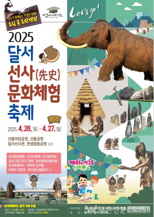 선사시대를 테마로 한 이 축제는 2014년 시작돼 가족 단위 방문객에게 선사문화유산을 쉽고 재미있게 체험할 수 있는 교육형 관광 콘텐츠로 자리 매김해 왔으며, 이번 축제는 선사시대로 테마거리 3단계 조성과 선돌보도교 준공에 맞춰 축제 장소를 기존보다 넓혔으며, ‘캐리와 친구들’ 뮤지컬, K-POP 댄스, 달서구 대표 캐릭터 달수․달희 선발대회 등 신규 프로그램이 대거 추가된다.