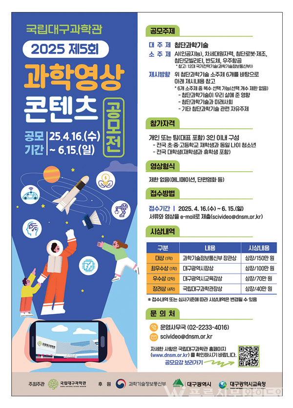 공모 자격은 개인 또는 팀(대표자 3인 이내)으로 구성된 전국 초중고·대학생이며 영상 형식에는 제한이 없다. 공모전 관련 자세한 사항은 국립대구과학관 홈페이지 내 공지/공고에서 확인할 수 있다.