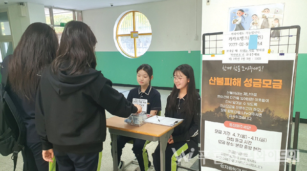 성지중학교(교장 김이환)는 학생자치회 주도로 지난 7일(월)~11(금)까지 진행된 ‘산불 재해 성금’ 모금 운동을 진행하여 총 55만 8,800원을 대한적십자사에 기부했다.