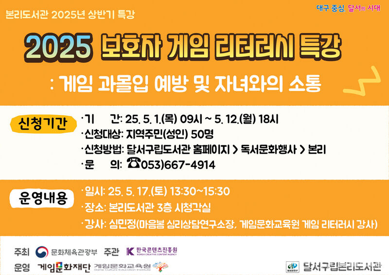 달서구(구청장 이태훈)는 오는 5월 17일(토) 오후 1시 30분, 본리도서관에서 학부모와 보호자 등 지역 주민을 대상으로 ‘2025 보호자 게임리터러시 특강’을 개최한다.