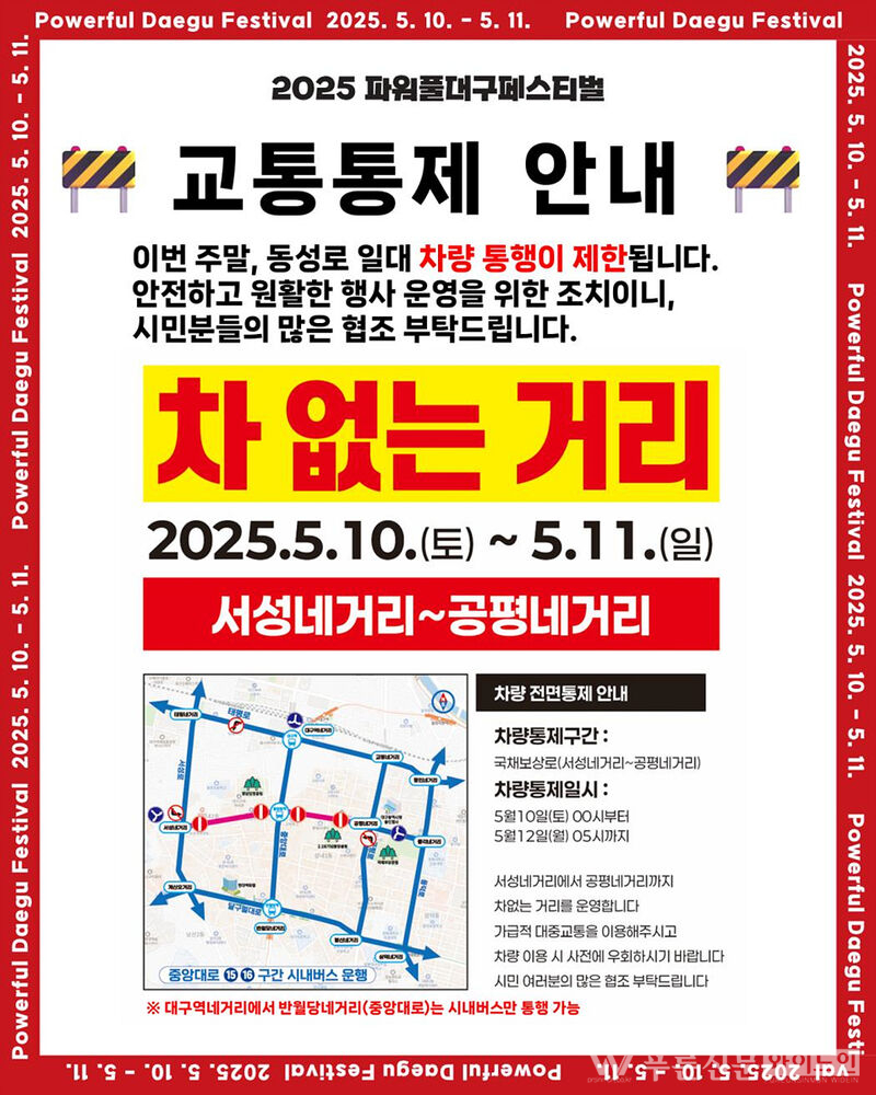 대구광역시가 오는 5월 10일(토)부터 5월 12일(월) 오전 5시까지 개최되는 ‘2025 파워풀대구페스티벌’ 기간 동안 국채보상로(서성네거리~공평네거리) 일대를 전면 통제해 ‘차 없는 거리’로 운영한다.