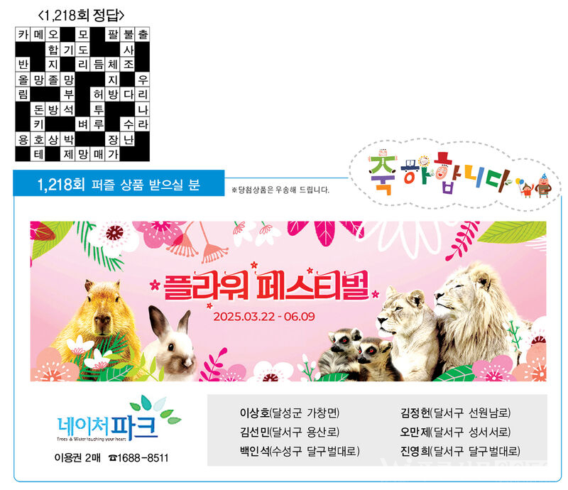◑ ‘가족과 함께 풀어보세요’ 낱말퍼즐을 만들어 푸른신문으로 보내주세요. 채택된 분께는 작은 선물을 우송해 드립니다.