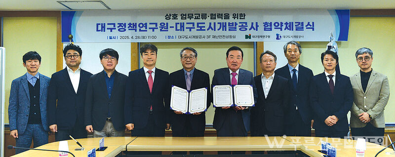 대구도시개발공사(사장 정명섭)와 대구정책연구원(원장 박양호)은 지역개발 및 지역 활성화를 위한 공동 연구와 정책 개발을 위해 상호 협력하기로 합의하고 지난달 28일(월) 대구도시개발공사 본사에서 업무협약(MOU)을 체결했다.